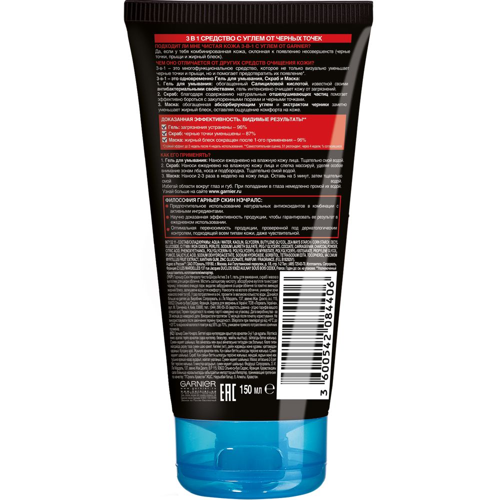 Garnier Гель + Скраб + Маска для лица "Чистая Кожа Актив 3-в-1 с углем" с экстрактом черники, углем и салициловой кислотой против черных точек, для жирной кожи, склонной к появлению несовершенств, 150 мл