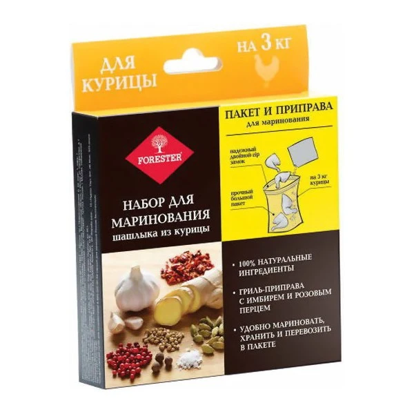 Набор для маринования шашлыка с розовым перцем и имбирем на 3 кг (zip-пакет и приправа) Forester РР-502 отличный выбор для приготовления куриного мяса. Он существенно сэкономит время подготовительных работ, поскольку в нем есть все необходимое для маринования курицы. В коробке находится приправа с натуральными специями (в их числе имбирь и розовый перец), а также плотный пакет с двойным zip-замком. Мариновать удобно и легко: куски мяса нужно поместить в специальный пакет и добавить туда смесь специй.