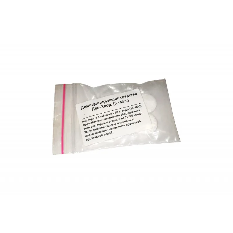 езинфицирующее средство Део-Хлор в таблетках. Очень экономично, 1 таблетка рассчитана на 10 л. воды. Применяется для дезинфекции различного вида инструментов, оборудования, поверхностей из пластика, стекла, стали, керамики, эмали, фаянса, фарфора, металлов в пищевой промышленности. Рекомендации по использованию: Растворите 1 таблетку в 10 л теплой воды (20 ° С). При этом получите 0,03 % раствор (0,015% активного хлора). Промойте все поверхности оборудования 0,03 % раствором и оставьте на 10-15 мин. Вылейте раствор и сполосните кипяченой или дистиллированной водой. Меры предосторожности: Беречь от детей. При попадании в глаза тщательно промыть водой и обратиться к врачу. При попадании на кожу промыть большим количеством воды. Не смешивайте с другими химикатами. При соприкосновении с кислотами образует ядовитый газ (хлорный газ). Хранить в сухом месте.