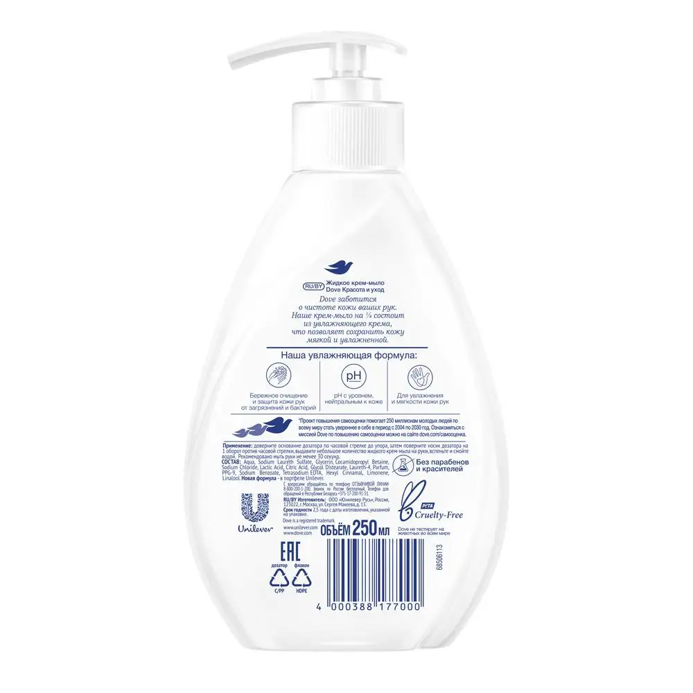 Жидкое крем-мыло и другая косметика Dove производится с заботой об окружающей среде и не тестируется на животных. Попробуйте ее и убедитесь в высокой эффективности продукции.