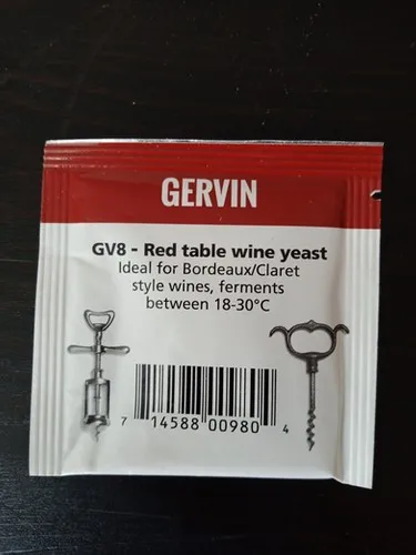 Yeast Gervin gv8 red table wine yeast, manufactured by Muntons (UK)-it's French strain wine yeast S.cerevisiae Narbonne for the production of dry red bordot wine (Bordeaux/Claret Bordeaux/claret style wines)). Yeast Gervin gv8 is considered an aromatic stamp that produces a pleasant and persistent aroma. Low foam formation during fermentation. Good glycerin levels. Fermentation in the temperature range 18-30 C. One pack of yeast 5G is enough to take out 23-25l of wine wort. инструкциядрожжи do not require preliminary regidrations. The contents of the package spread over the surface of the prepared wine wort (do not require stirring).