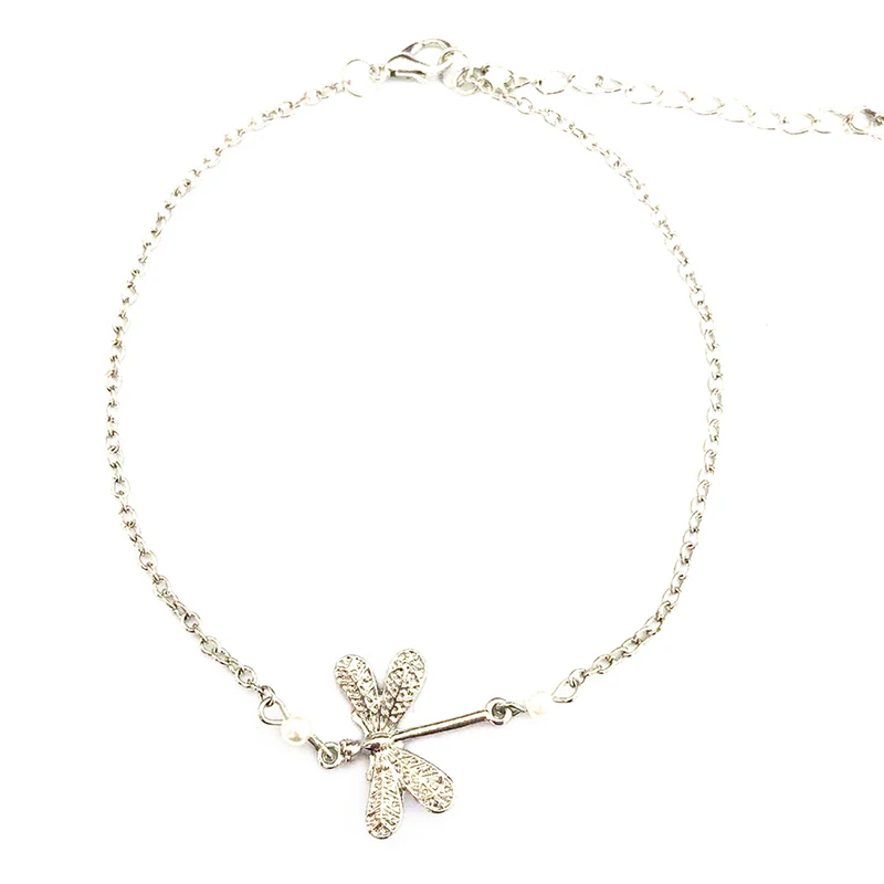 Размер: длина ножного браслета 27 см, длина удлинительной цепочки 6 см, размер стрекозы 2,4*2,2 см