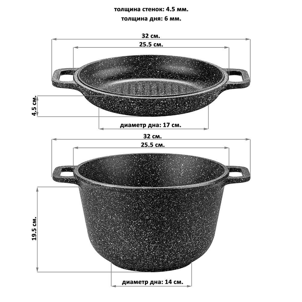 Kazan with a volume of 5 liters of the "Granite dream" series with a lid, which can be used as a grill pan, suitable for cooking dishes from vegetables, meat and fish. Kazan is made of cast aluminum in Russia and has an ultra-strong double-layer non-stick coating Kaplon classic. The main advantage of the coating is resistance to scratches and wear. The coating is safe for human and does not contain PFOA or other harmful substances. Do not heat without products. Let the dishes cool before putting it in the water. Use only wooden and silicone blades. Do not wash with abrasive detergent. Use in the dishwasher only in "eco" mode. With all recommendations, a set of dishes with non-stick coating guarantees comfort and ease of operation!