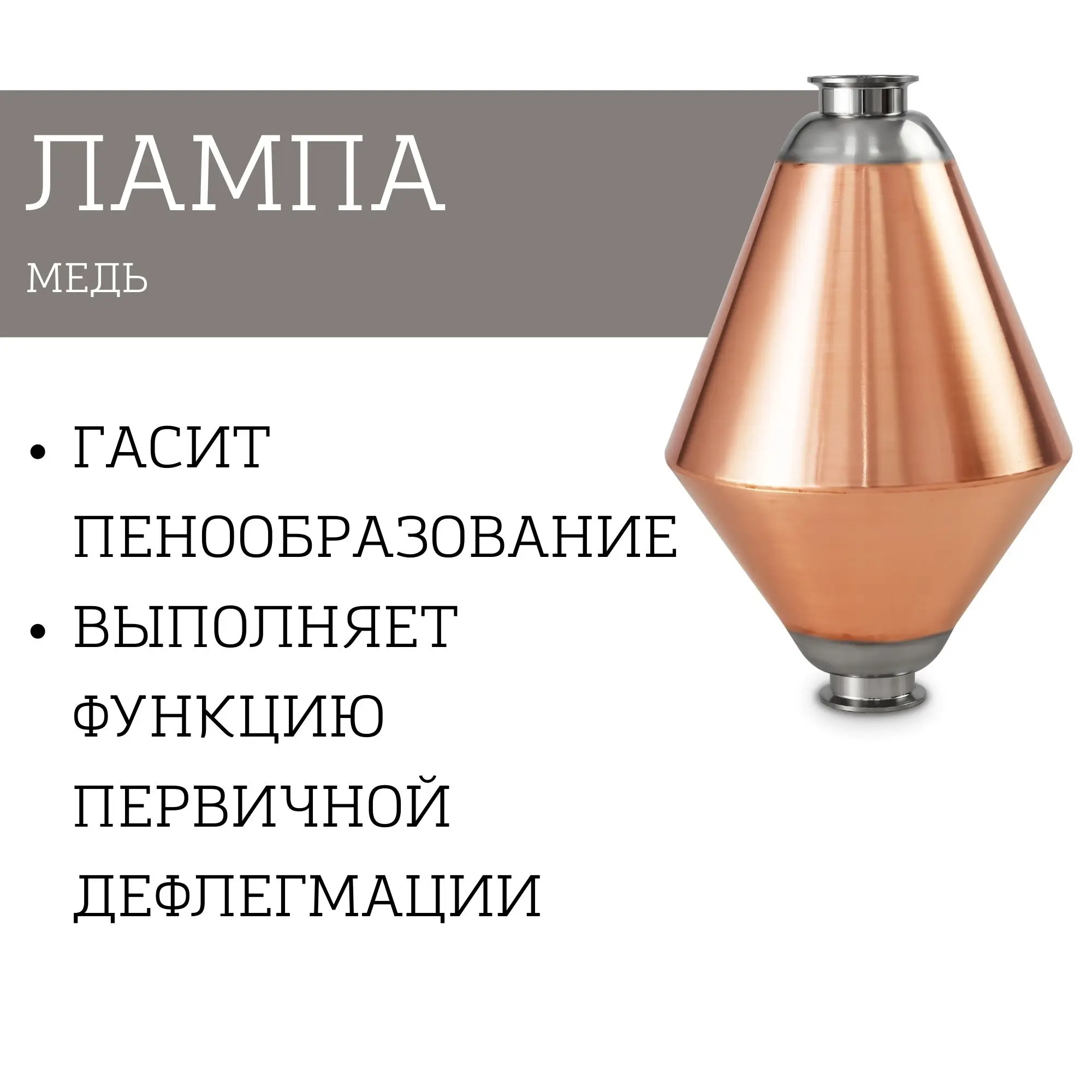 ЛампаЛампа устанавливается на перегонный куб при помощи клампового соединения диаметром 2 дюйма. Она используется при приготовлении ароматизированных напитков, так как позволяет сохранять органолептические свойства сырья. Поднимаясь из перегонного куба, пар охлаждается и частично конденсируется на стенках лампы. При этом флегма, содержащая тяжелые фракции, стекает обратно в бак, а легкие спиртосодержащие пары проходят дальше в колонну, что способствует укреплению и очищению конечного продукта. Возможно изготовление лампы как из нержавеющей стали, так и из меди. Медь абсорбирует неприятный запах и улучшает вкус продукции.