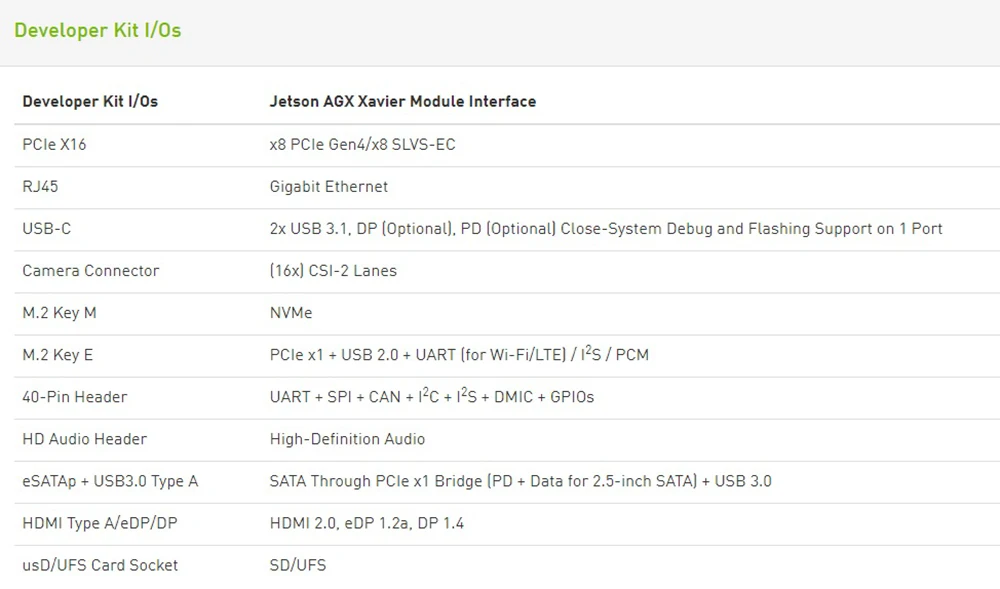 Начните сегодня с комплектом разработчика Jetson AGX Xavier. Jetson Development Pack (JetPack)-это пакет «Все-в-одном», который объединяет и устанавливает все программные средства, необходимые для разработки для встроенной платформы NVIDIA Jetson. JetPack включает инструменты для:Глубокое обучение:TensorRT, cuDNN, NVIDIA DIGITS™Рабочий процессКомпьютерное зрение:NVIDIA VisionWorks, OpenCVВычисления графического процессора:NVIDIA CUDA, библиотеки CUDAМультимедиа:Поддержка ISP, изображения камеры, Video CODECIt также включает Совместимость с ROS, OpenGL, расширенные инструменты разработчика и многое другое.МАЛЕНЬКИЙ ПРОЧЕРЕЗ ВО ВСТРОЕННЫХ ПРИЛОЖЕНИЯХИмея размеры всего 100x87 мм, Jetson AGX Xavier предлагает большую производительность рабочей станции при 1/10 размера рабочей станции. Это делает его идеальным для автономных машин, таких как роботы доставки и логистики, Заводские системы и крупные промышленные БПЛА. ПРИНЯТЬ ДЕЯТЕЛЬНОСТЬ К КРАЮБудучи первым в мире компьютером, разработанным специально для автономных машин, высокая производительность Jetson AGX Xavier может обрабатывать визуальную одометрию, слияние датчиков, локализацию и картографирование, обнаружение препятствий, и алгоритмы планирования пути, критически важные для роботов следующего поколения. Получите производительность класса рабочих станций GPU с беспрецедентными 32 TeraOPS (TOPS) пиковых вычислений и 750 Гбит/с высокоскоростного ввода/вывода в компактном форм-факторе 100x87 мм. СИЛА ГИБКОСТИПользователи могут настраивать режимы работы на 10 Вт, 15 Вт и 30 Вт по мере необходимости для своих приложений, обеспечивая новые уровни плотности вычислений, энергоэффективности и возможностей вывода AI на краю.Технические характеристики