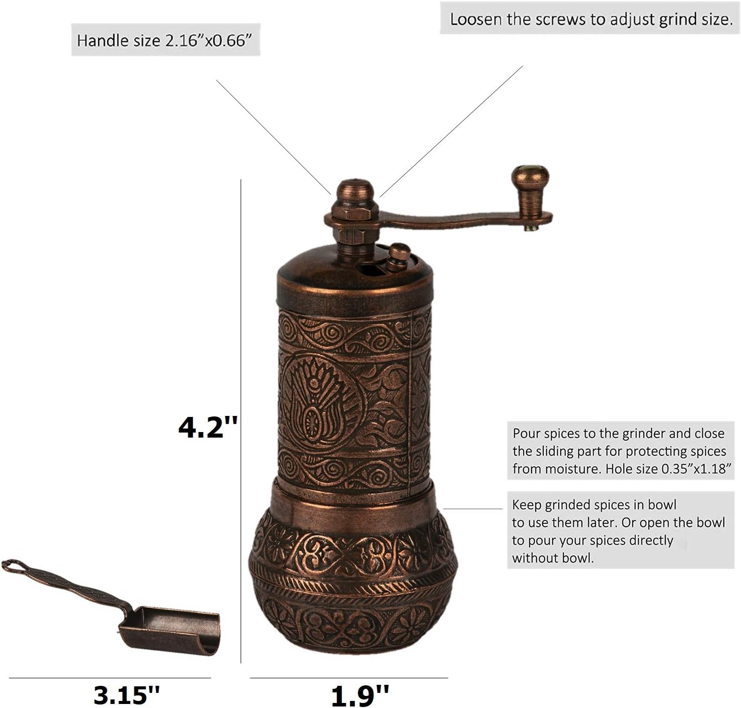 Оттоманский стиль, традиционная мельница для перца является декоративной и функциональной. Винтажная шлифовальная машина для специй с короткой ручкой, съемным украшенным держателем и скользящим отверстием для заливки. С гофрированными роликами турецкие ручные дробилки производят более равномерное распределение размеров