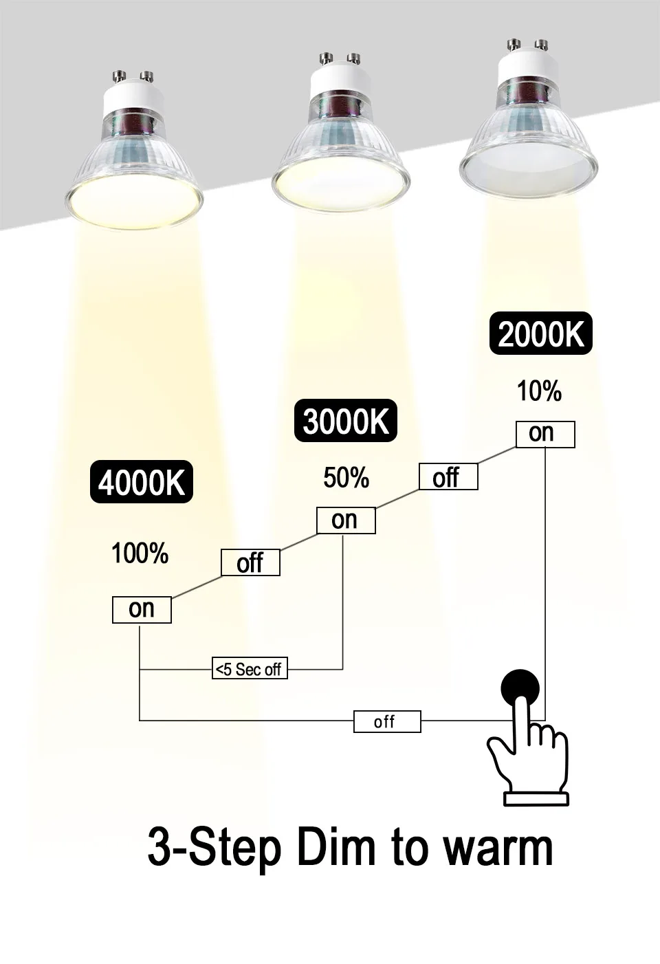 5 шт. Светодиодный точечный светильник GU10 AC 220-240 В лампа 3 шаг тусклый теплый 5 Вт 7 Вт SMD 100 ° комнатный светильник для спальни холодный теплый белый светильник Описание товара: Наименование товара: светодиодный прожектор Тип основания: GU10 Напряжение: 220-240 В переменного тока Мощность: 5 Вт/7 Вт CRI: 90 Угол луча: 100 ° Материал: алюминий + АБС-пластик Функция: 3 шага тусклый, чтобы согреться