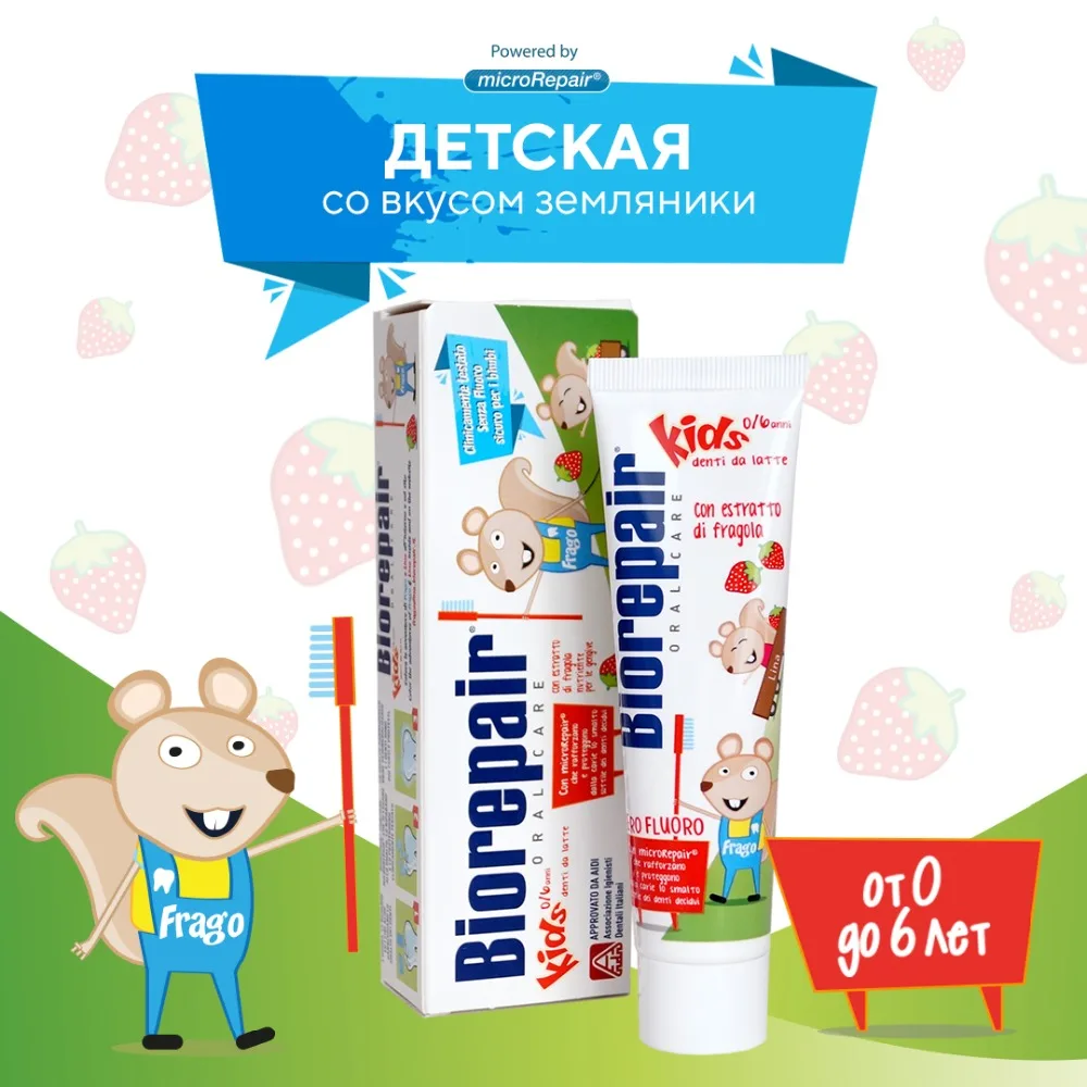 Детская зубная паста для ежедневного применения. Восстанавливает эмаль. Облегчает процесс прорезывания зубов благодаря экстракту земляники. Увлажняет и питает десны. Защищает от кариеса.