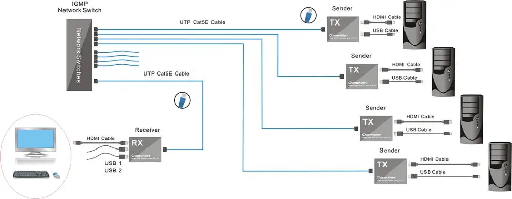 CHV592P использует технологию IP network для обработки и распространения видеосигналов высокой четкости и в то же время посылает сигналы управления мышью и клавиатурой от получателя до приемника для реализации функции расширения KVM. В то же время, он может поддерживать один раб для управления до 48 хостов и реализации функции переключения KVM.