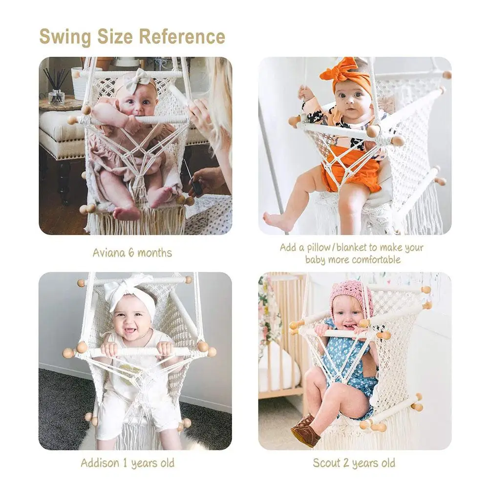 4. Широкое применение: Наслаждайтесь счастьем в любое время и в любом месте. Использование нашего нейтрального детского сиденья-это уникальный способ наслаждаться счастьем с вашим маленьким! Он очень подходит для детских садов, гостиных, спален, подвалов, запасных комнат, солнечных комнат, дворов, задних дворов и т. Д.-подвешивается рядом с внутренней кроватью или размещает ребенка портативными качелями на открытом воздухе, сделать ребенка счастливым.