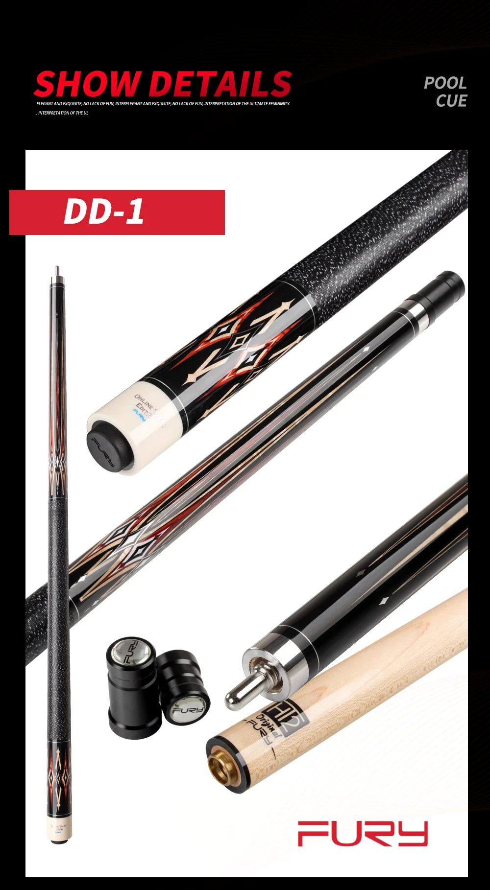 Name:DD-1/3 Ferrule:XTC Ferrule Structure:1/2 Split Cue Style:Pool Cue Wrap:Irish Line Grip Shaft:North American Maple Shaft Weight:19-20oz Tip Size:12.5mm Tip:Tiger Red Line Tip