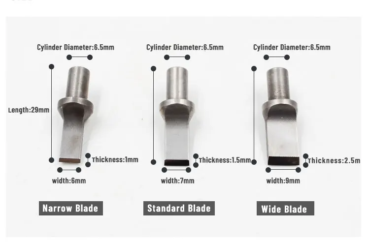 Узкое Лезвие: толщина: 1 мм; Ширина: 6 мм Стандартный лезвия: Толщина: 1,5 мм; Ширина: 7 мм Широким лезвием: Толщина: 2,5 мм; Ширина: 9 мм