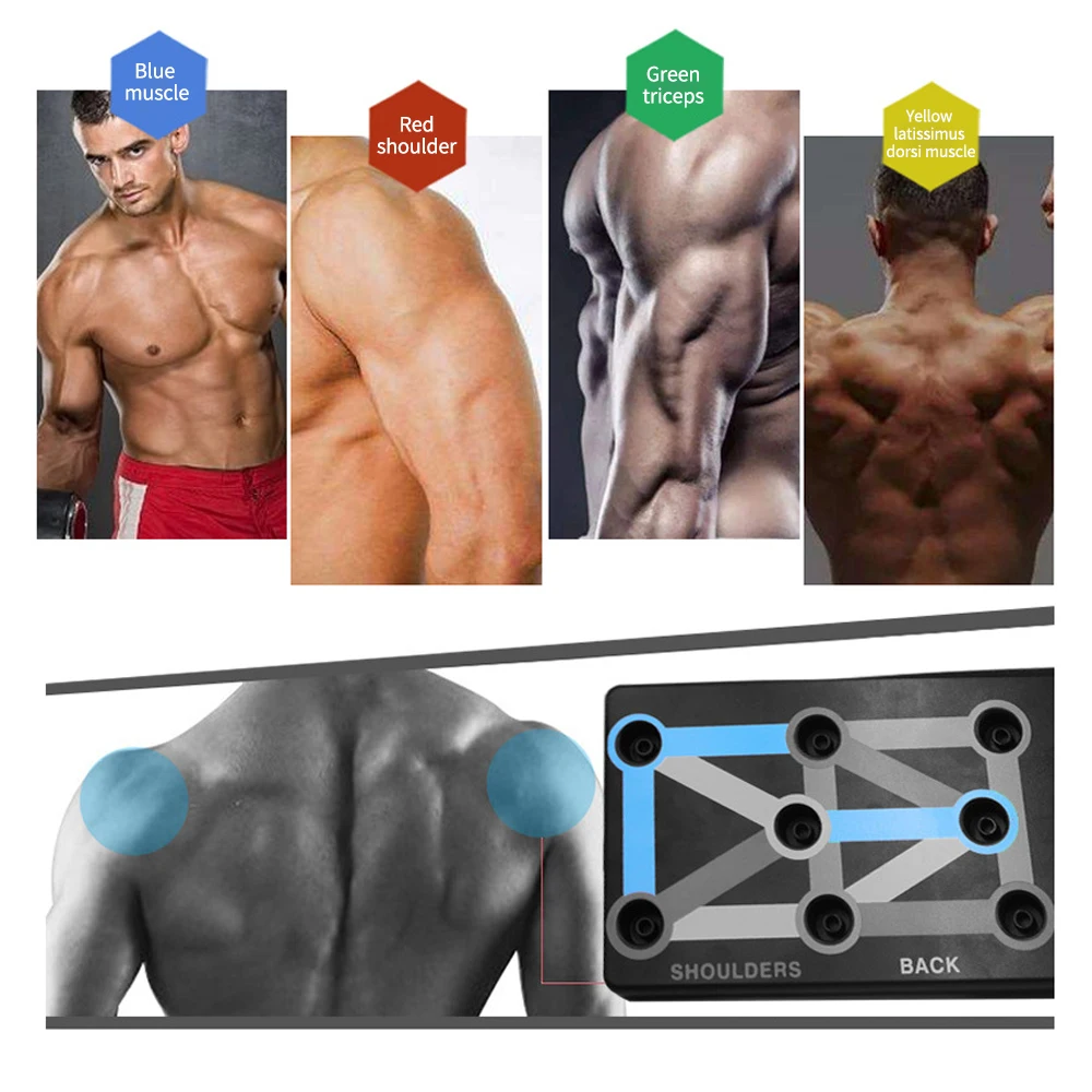 Различные цвета-кодовые поджимная доска цели специфика мышц (синий-грудь, красный-плечи, желтый-назад, и зеленый-трицепс)