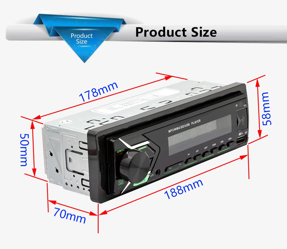 Многофункциональный Bluetooth автомобильный mp3-плеер Спецификация продукта: Встроенный Bluetooth + микрофон Поддержка громкой связи. Поддержка расширенного режима передачи звука. Поддержка индикации часов во время выключения питания. Высокое качество цифровой стерео fm-радио Поддержка трех диапазонного магазина радио FM1-FM2-FM3, и может установить 18 радиостанций. (Радиочастота: 87,5-108 МГц) Поддержка USB/TF кард-ридер Поддержка аудио: форматы MP3/WMA/WAV и так далее. Поддержка функции воспроизведения папок Поддержка дистанционного управления. Вращающийся электронный регулятор громкости MP3 play поддерживает пауза/предварительный просмотр/повтор/случайное воспроизведение и 10 треков вверх/вниз. Электронный Тип Басов/ВЧ/левый и правый баланс/передний и задний баланс регулятор громкости Переднее входное отверстие AUX аудио и задний Терминал L / R аудио RCA выходное отверстие. 4 трека высокой мощности (4 громкоговорителя высокой мощности) Рабочее напряжение: DC12V