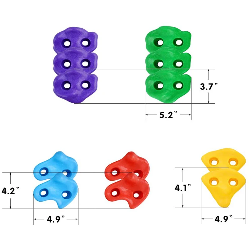 1. Разные цвета, предназначены для детских игр. 2. Эти скальные камни имеют текстуру, поэтому их легче держать и вешать для детей. 3. Он не должен использоваться для скалолазания или любой среды высотой более 6 футов. 4. Изготовлен из нетоксичного пластика, прочный и прочный.