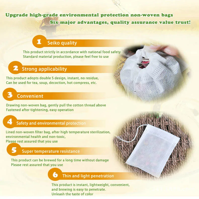 Материал: nowoven Цвет: как показано на рисунке Посылка: 1 посылка = 100 шт. Особенности: экологически чистый Использование: китайская медицина отвара/кофе/готовка специй трав Примечание: Все продукты измеряются вручную. Изделие может оставить необработанный край и может иметь отклонение 1-2 см. Из-за различий в компьютерных мониторах фактические цвета могут незначительно отличаться от показанных.