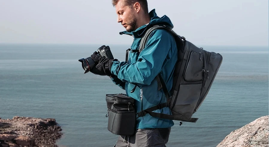 Сжимаемое пространство для хранения в передней части рюкзака вмещает фотооборудование, такое как Ronin SC, а также ваши предметы первой необходимости, такие как одежда, комплект для сна и т. д.