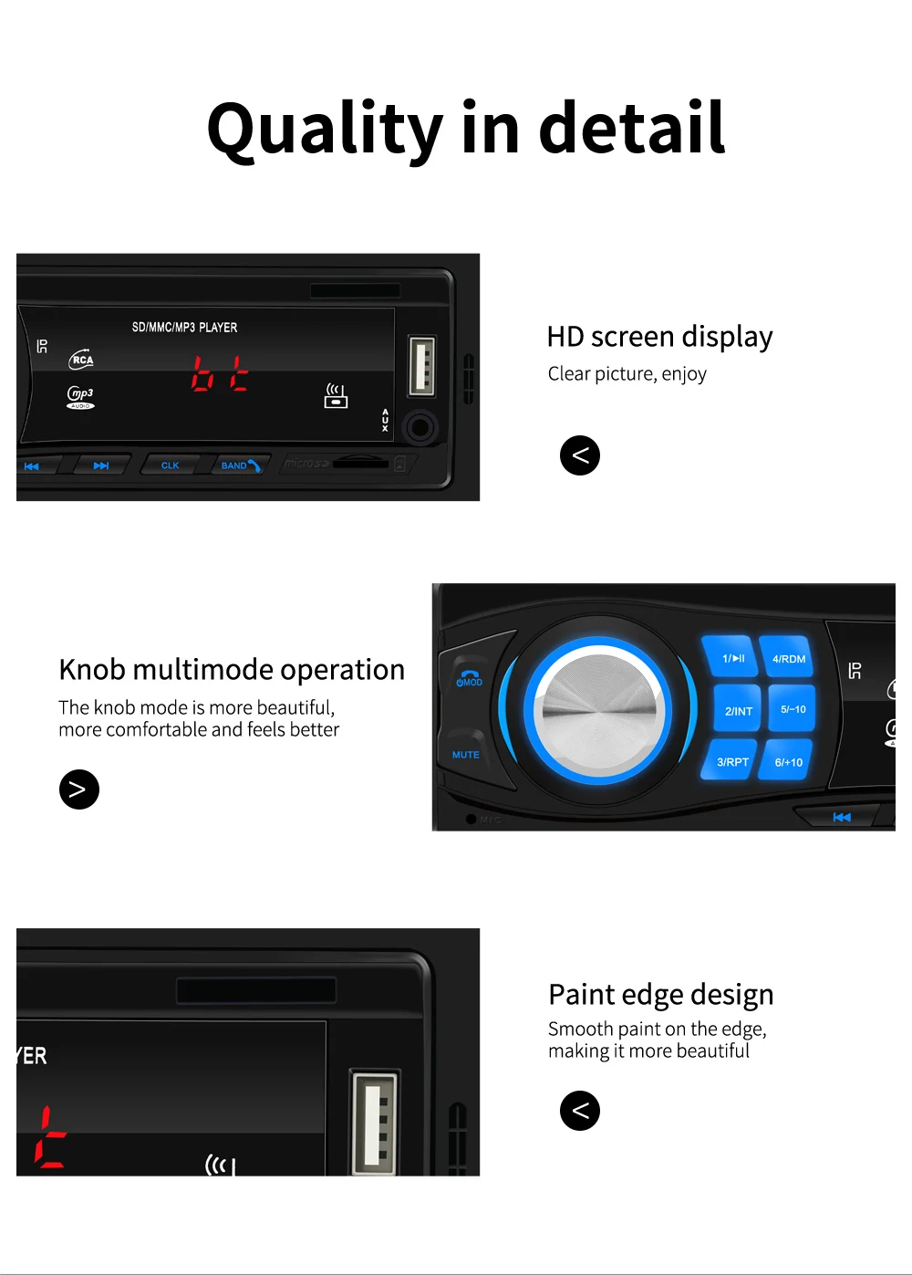 Характеристики: Модель: 8013 Напряжение: 12 В Тип: автомобильный стерео MP3-плеер ОС: нет Конфигурация: нет Программное решение: SC3510 Тип экрана: Размер экрана: нет Разрешение экрана: нет Размер панели: 188*58 мм/7,40*2,28" Светильник панели: Красный светильник Размер цветной коробки: 220*82*181 мм/8,66*3,23*7,13" Хост: материал подошвы: полиуретан толщина 100 мм/3,94" Вес одной машины: 460 г Мобильный телефон подключение: нет Gps-навигация: Радио диапазон: FM Радиочип: интеграционный чип Язык: нет Мощность: 45 Вт Рабочая температура: -10 ~ 60 ° C Функция обратного изображения: не поддерживается Функция напоминания о тормозе: не поддерживается Функция управления рулевым колесом: не поддерживается Модель Bluetooth: BT car Чип усилителя: YD1028 Радиочастота: 87,5 ~ 108 МГц Видео: нет Зеркальное отображение экрана: не поддерживается Интегрированная автономная карта: нет Мобильный телефон подключение: нет Беспроводной WiFi: Слот для tf-карты: Да Слот для карты GPS: нет Пульт дистанционного управления: пульт дистанционного управления Пульт дистанционного управления рулем: нет Интерфейс USB и версия: передняя панель USB2.0 Кнопка сброса: Нет Кнопка: Физическая кнопка RCA терминал входного сигнала: 4-канальный аудио выход Передний вспомогательный аудио вход: Да Мобильный телефон функция подключения: не поддерживается Функция DVR: не поддерживается Функция DAB: не поддерживается Функция OBD: не поддерживается Функция ТВ: не поддерживается Модель движения DVD: нет 4G / 3G: не поддерживается Замена логотипа: не поддерживается Поддерживаемые Аудиоформаты: MP3 / WMA / WAV / FLAC Поддерживаемые форматы видео: Нет Поддерживаемые форматы изображений: нет Заводская Настройка пароля: Нет Примечания: 1. Могут быть небольшие различия в размере из-за ручного измерения, различных методов измерения и инструментов. 2. Изображение может не отражать фактический цвет изделия из-за различных фотографий светильник, угол и экран монитора. 1 хост 1 х шнур питания 1 пульт дистанционного управления 1 X pry инструмент 1 х Руководство