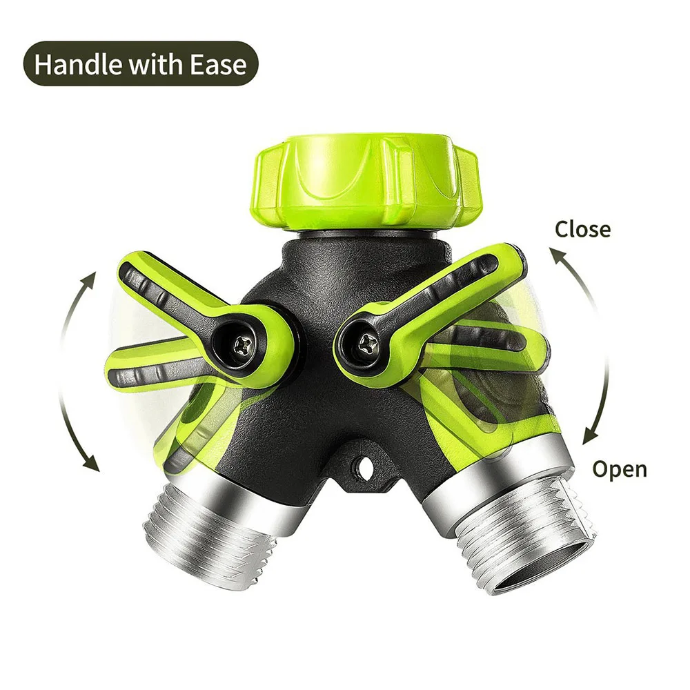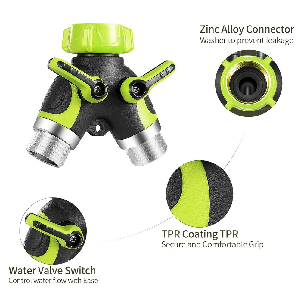 100% абсолютно новый и высококачественный садовый шланг, отводящий клапан! Дополнительные длинные ручки 4 см легко включаются и выключаются в любую погоду, лучший выбор для артритных рук. Прочная конструкция с металлическим и резиновым покрытием обеспечивает долгий срок использования. Название продукта: 2 Way садового шланга Материал: цинковый сплав + высококачественный пластик Цвет: зеленый и черный Стандарты продукции: Американские стандарты Размер резьбы: 3/4 дюйма