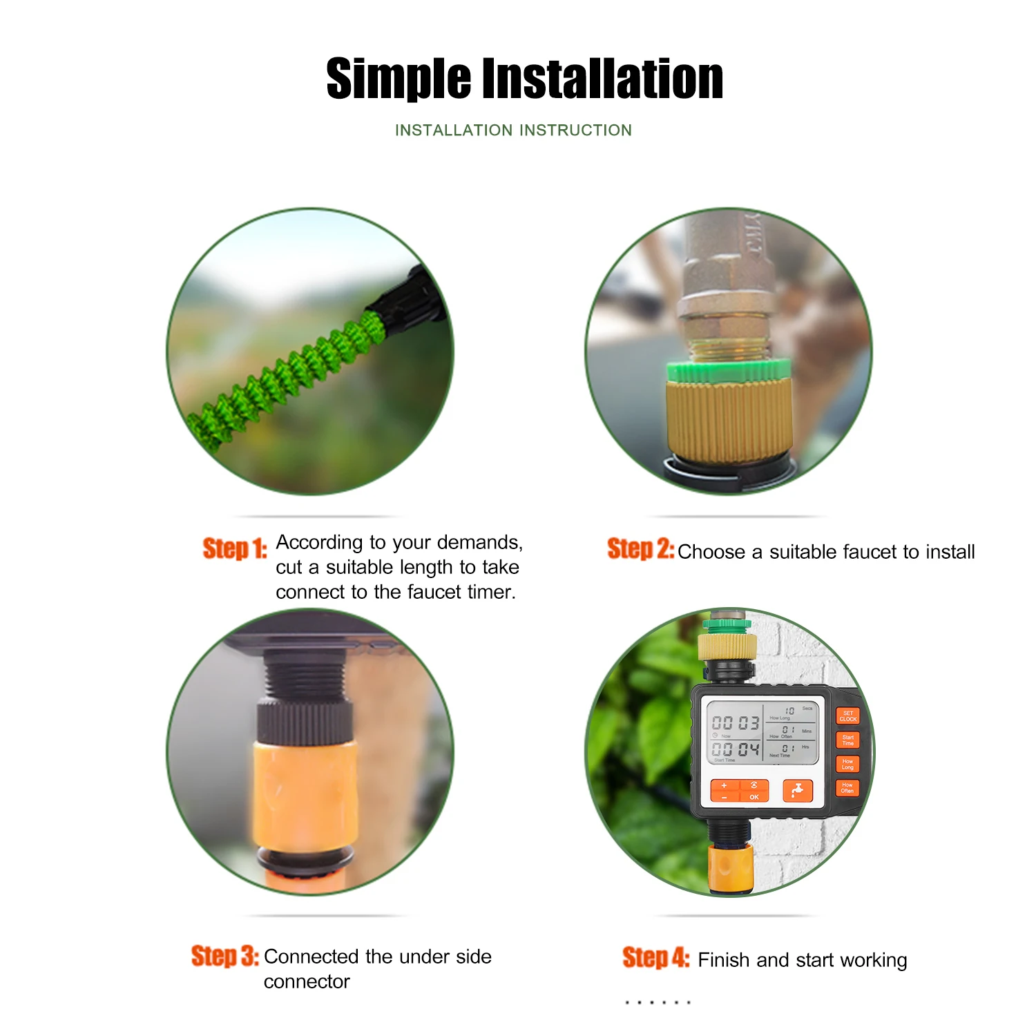 Цифровой программируемый таймер воды--- Более широкий диапазон времени и интервала работы. Продолжительность полива составляет от 1 до 99 часов, а интервал орошения-от 1 ч до 99 часов. Это может сделать вас график полива полностью настраиваемым и может сотрудничать с законом роста растений и создать более красивый ландшафт.