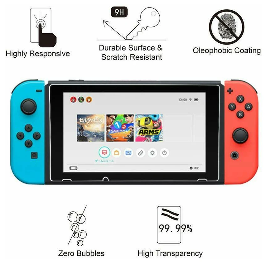 Высокочувствительное закаленное стекло для защиты экрана может защитить ваш Nintendo Switch от царапин и олеофобного покрытия.