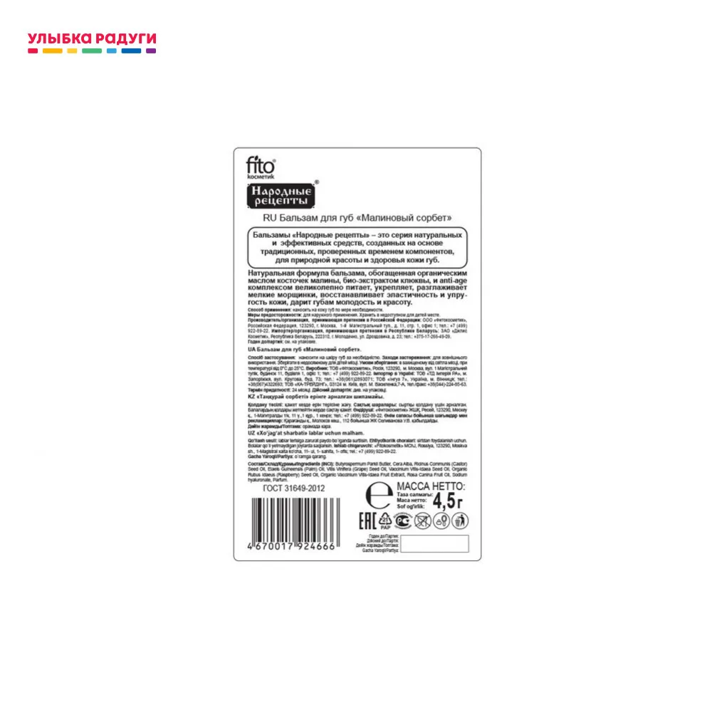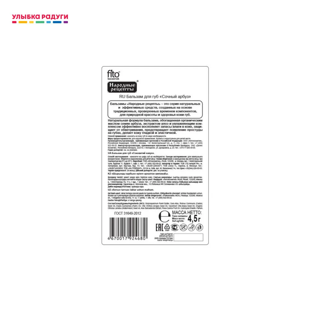 Отзывы о Бальзам для губ ФИТОкосметик Народные рецепты натуральный 4 5г в ассортименте |