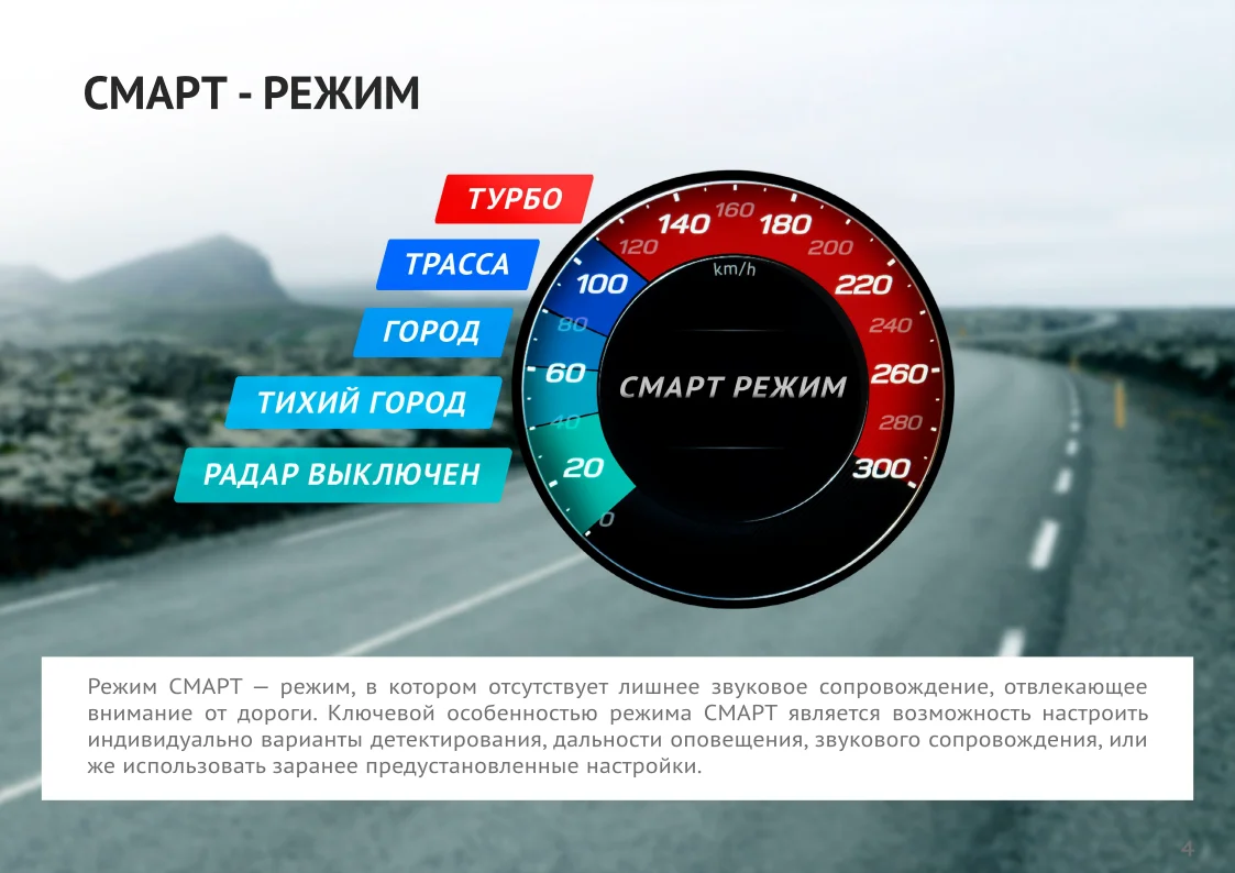 Режим SMART - чувствительность радар-детектора изменяются в зависимости от скорости автомобиля. Переход с режима «Город» в режим «Трасса» и наоборот происходит автоматически.