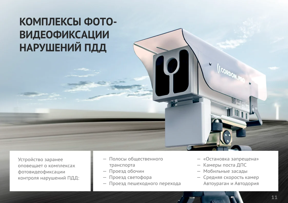 GPS-модуль с обновляемой базой данных камер 45-ти стран (Россия, СНГ: Узбекистан, Казахстан и др.), оповещает о «малошумных» камерах (Кордон, Кречет, Mesta, Рапира, Вокорд «Циклоп», RedSpeed, Скат, Робот, Multaradar, Одиссей), и «парных камерах» без радарного блока, вычисляющих среднюю скорость (Автоураган, Автодория, Сергек).