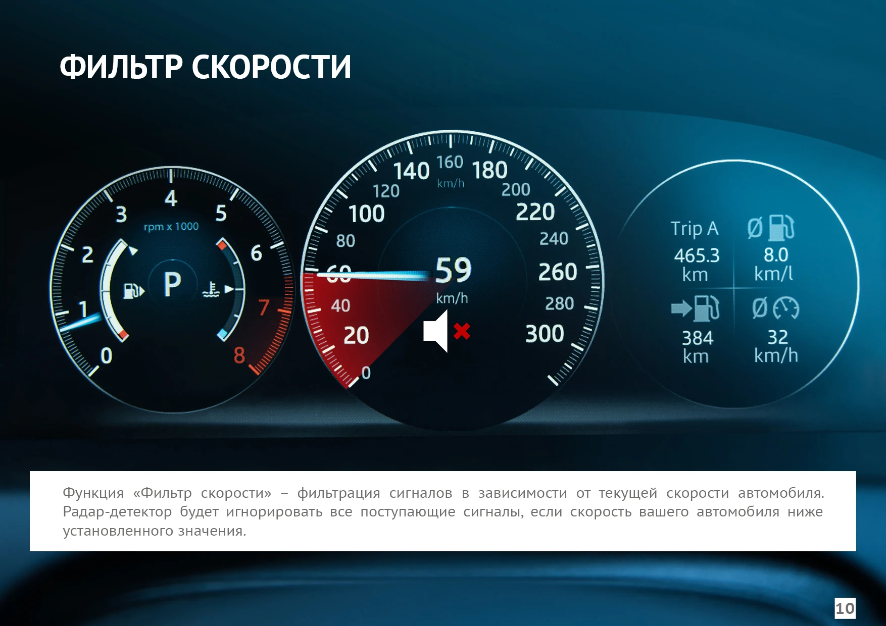 Устройство обладает функцией «ФИЛЬТР СКОРОСТИ». С ее помощью фильтрация сигналов происходит в зависимости от текущей скорости автомобиля. Ваш радар-детектор будет игнорировать все поступающие сигналы, если скорость автомобиля ниже установленного значения.