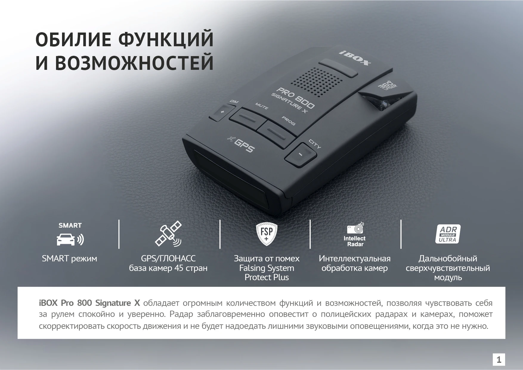 iBOX Pro 800 Signature X - радар-детектор с GPS/ГЛОНАСС базой камер, оснащенный улучшенным сверхчувствительным модулем ADR Ultra для максимальной дальности обнаружения полицейских камер.