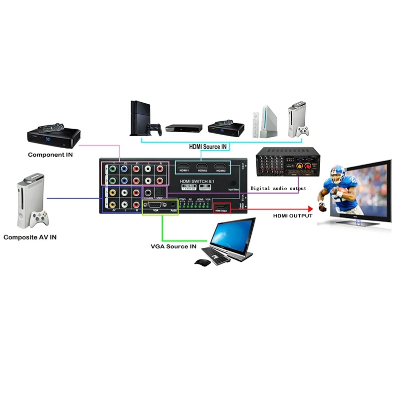 Этот HDMI коммутатор предлагает решения для цифрового развлекательного центра, HDTV розничной торговли и шоу-сайта, HDTV, DVD, телеприставки и проекторной фабрики, шума, пространства и безопасности, управления центром обработки данных, распространение информации, презентация конференц-зала, школа и Корпоративное обучение окружающей среды. 8-входы-1 выходы Многофункциональный видео/o переключатель.