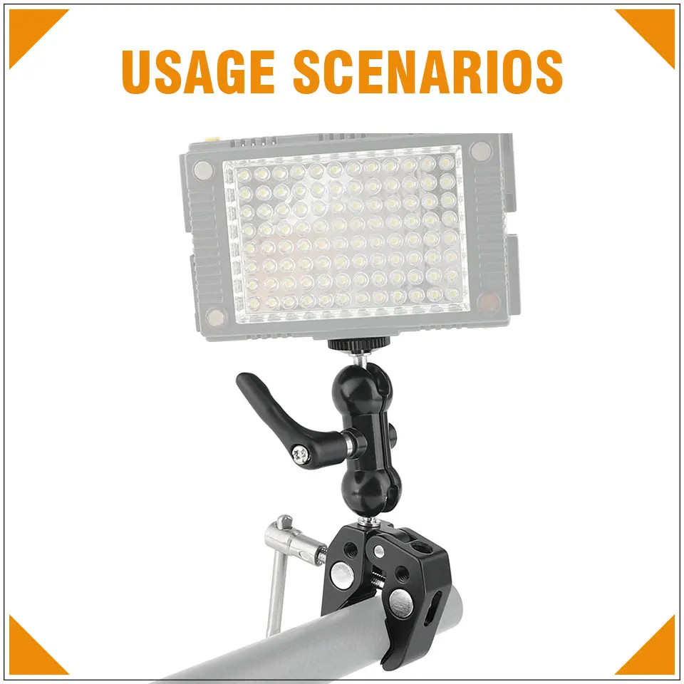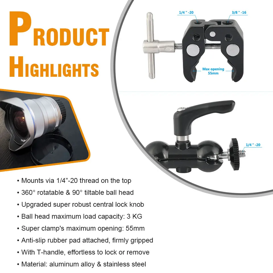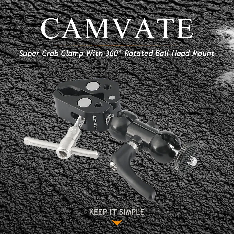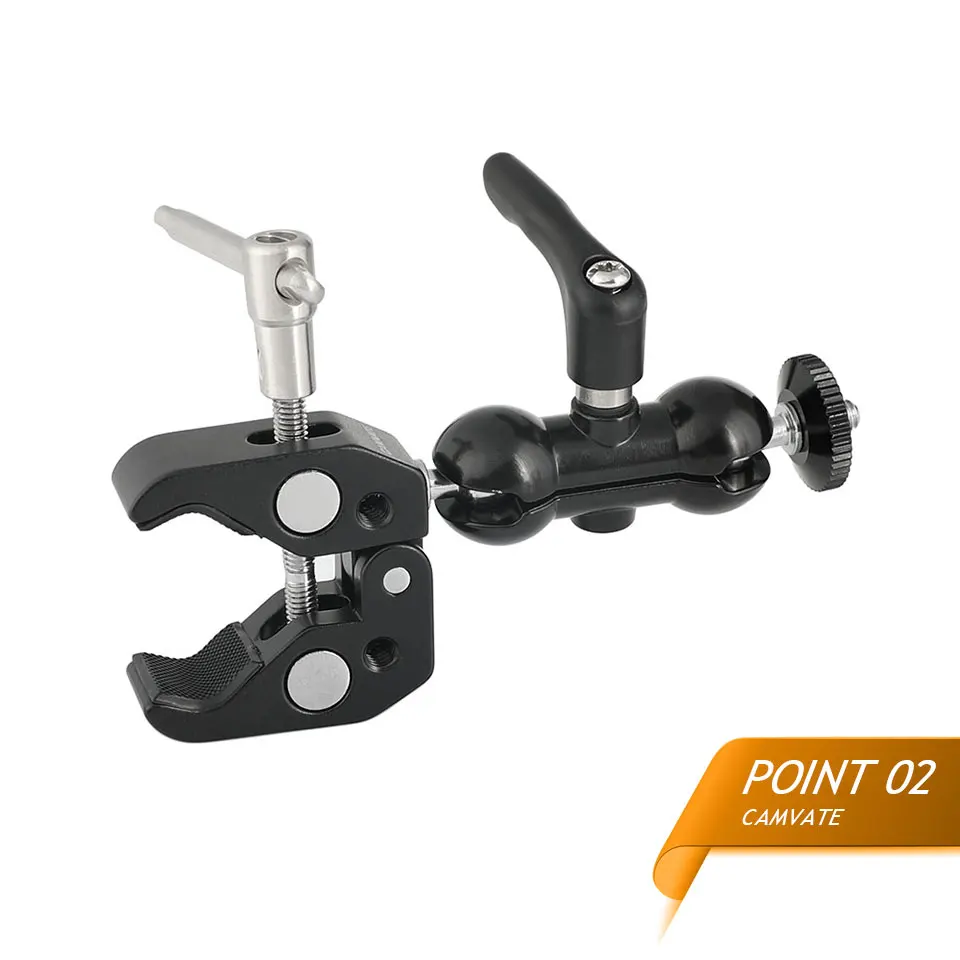 • Максимальное отверстие CAMVATE Super clamp до 55 мм. Он может быть широко использован для DSLR, камер, светильник, стойки, стержни/палки, флэш-светильник s, крючки, полки, поперечные стержни и т. Д. Он поставляется с противоскользящей резиновой прокладкой, которая поможет более надежно закрепить изделие и уменьшить царапины.