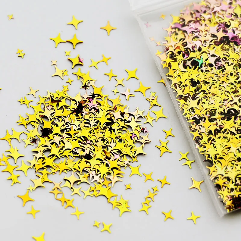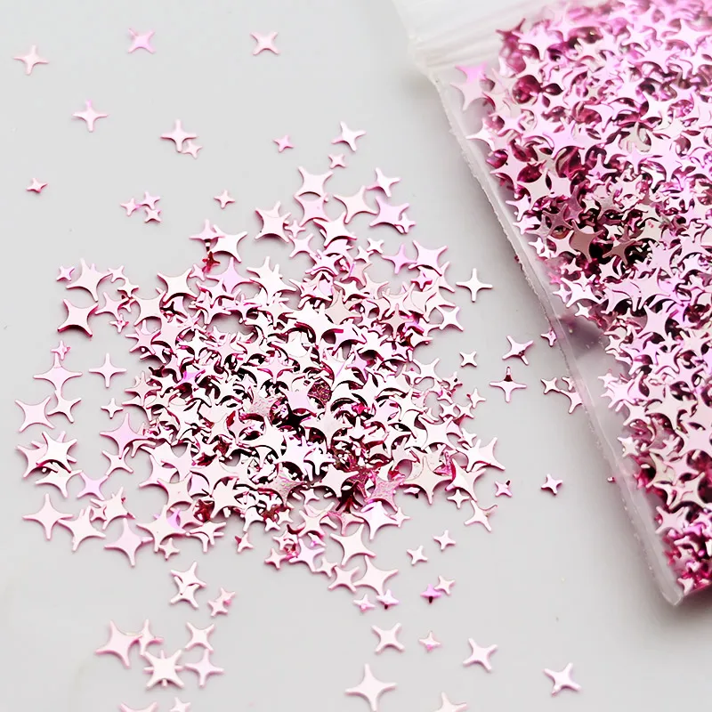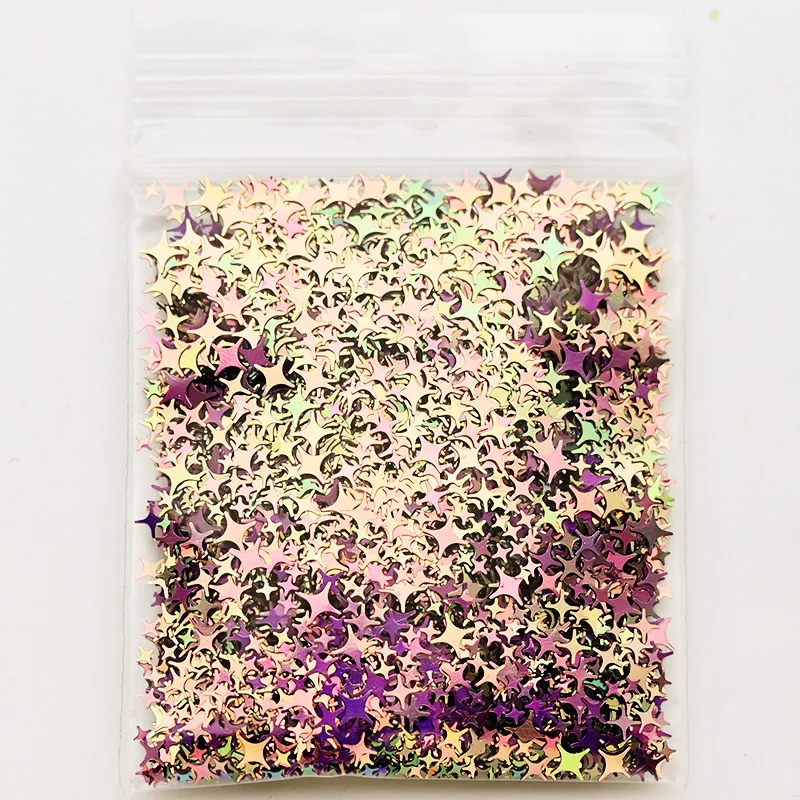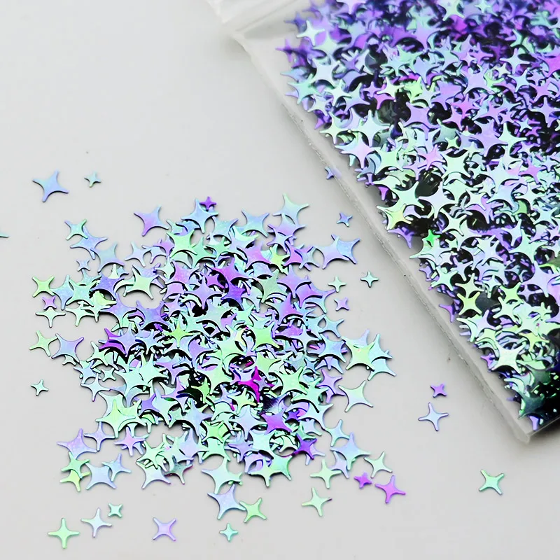 Блестки Starlight изготовлены из розового металла и радужного блеска, фиолетового металлического цвета, в форме: шестиугольник, звезда и порошок блеск. Массивный блеск можно использовать на лице, теле, волосах и ногтях.