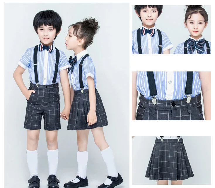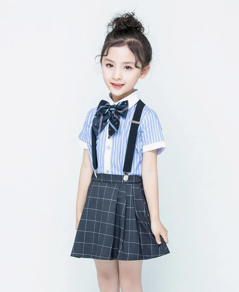 Детские синие рубашки в британском стиле для мальчиков и девочек, 4 шт. плиссированная юбка, шорты комплект школьной формы, темно-синие комбинезоны с короткими рукавами, костюмы для студентов