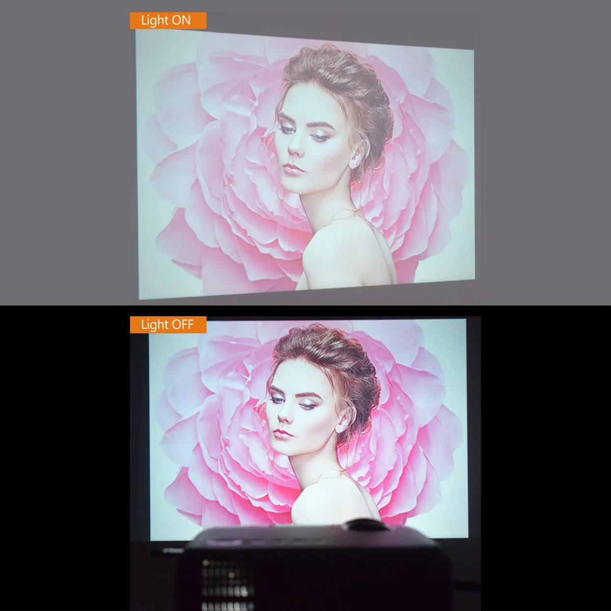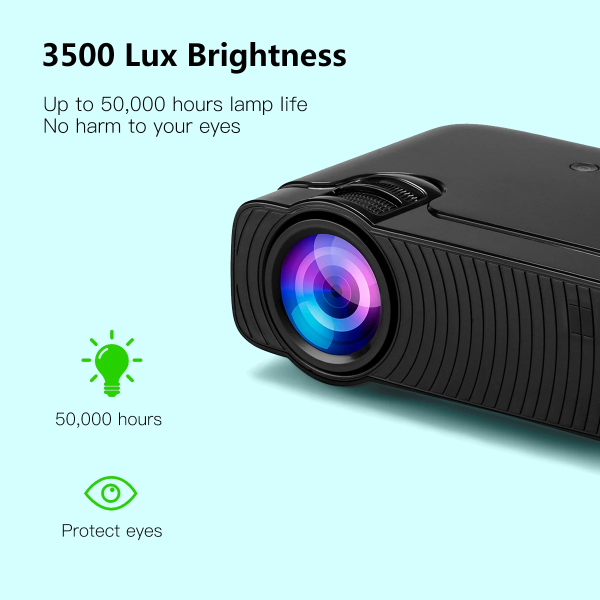 [Высокая яркость]:1280*720 собственное разрешение, поддержка 1080P, проектор для домашнего кинотеатра обеспечивает четкое изображение в условиях низсветильник ности. Яркость 3500 люкс, срок службы лампы до 50000 часов, без вреда для глаз.