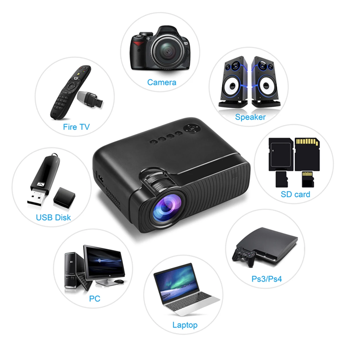 [Совместимые устройства]:Оснащен различными входами, в том числе AV/USB/HD/VGA/SD/DC IN. Совместимость с U-диском, мобильным жестким диском, ПК, ноутбуком, PS4, ТВ-приставкой, DVD и т. д. поддержка аудиовыхода 3,5 мм, его можно подключить к наушникам или динамику.