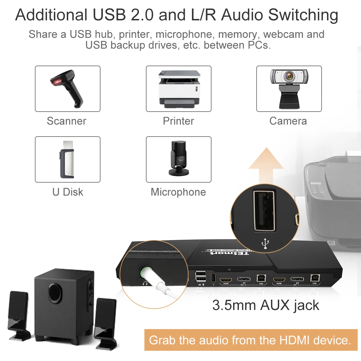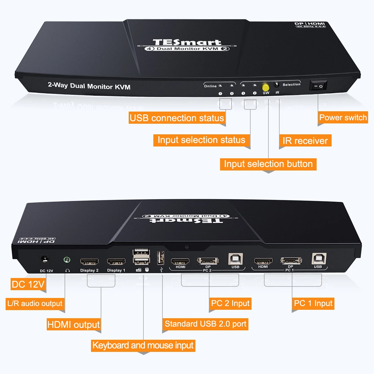 Двойной монитор TESmart DisplayPort KVM переключатель поддержка UHD 4K @ 60Hz USB 2,0 устройства управляют до 2 компьютеров с (DP + HDMI + USB)