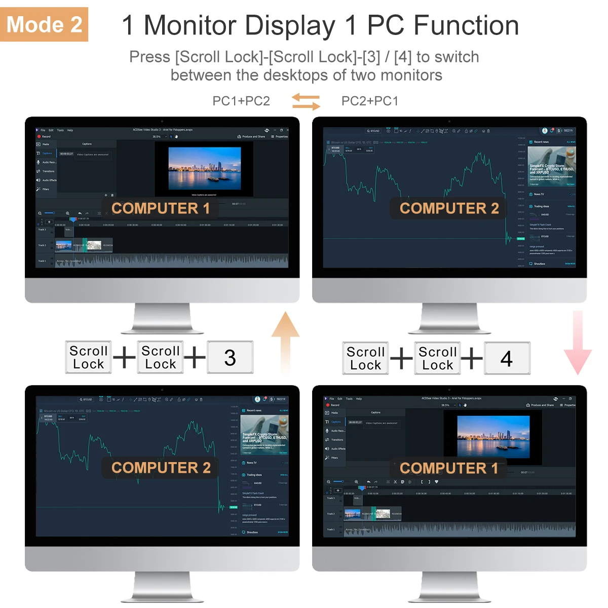 Этот двойной монитор KVM 2x2 поддерживает только Набор клавиатуры и мыши и 2 монитора для управления 2 шт. Поддерживает переключение между клавиатурой и мышью и внешними устройствами и аудиоканалами с помощью команд hotkey без переключения порядка на экран.