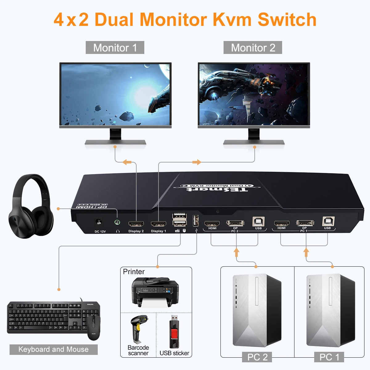 Отзывы о Порт дисплея + HDMI 4x2 двойной монитор KVM переключатель с 2 портами обновление 4K @ 60 Гц