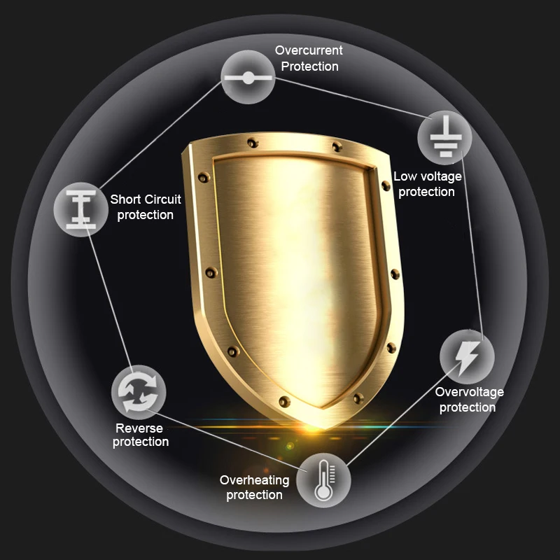 Изготовлен из высококачественного АБС-пластика, водонепроницаемого IP65, мульти-защищает от перегрузки по короткому замыканию/полярности, оснащен функцией постоянного импульсного тока, чтобы избежать перезаряда и разрядки; полная загрузка и испытание на ожоги доказывают его высокую надежность, стабильную производительность и длительный срок службы
