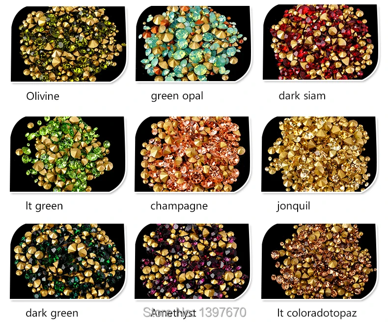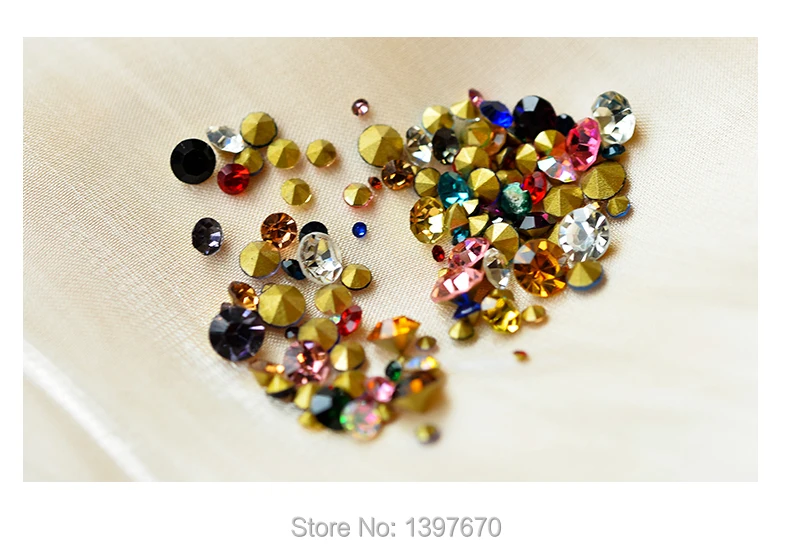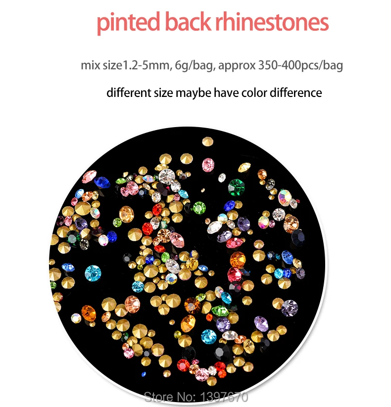 Цвет спины:БронзаИли золотой или черный (мы отправляем случайным образом) Цвет: Пожалуйста, выберите (смешанные цвета смешиваются случайным образом) Кол-во:6 грамм в партии Стиль: с заостренным фольгированным дном сзади Машинная резка Материал: хрустальные стразы Размер: 1,2-5 мм случайно смешанные цвета |