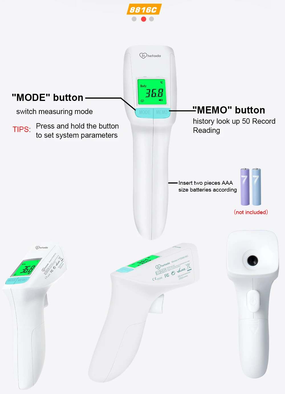 Когда термометр включен, нажмите «MEMO», чтобы посмотреть измерение. Можно вспомнить 50 наборов данных температуры,👀Примечание:HTD8216C только один набор данных памяти.