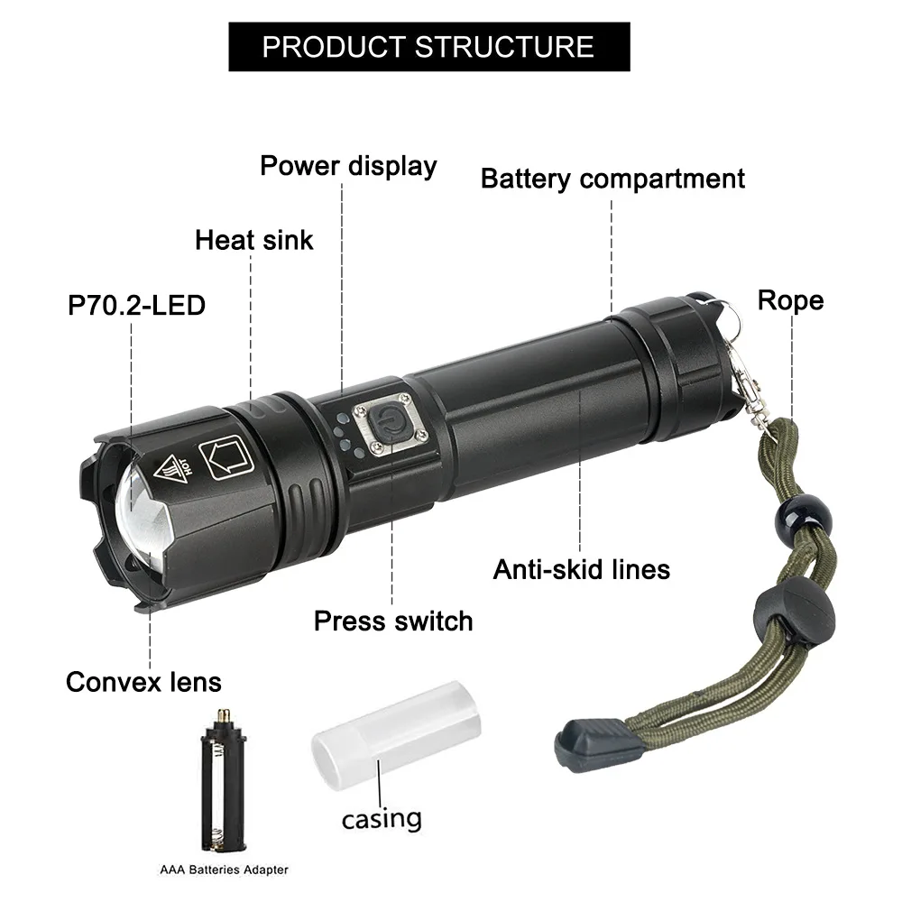 【Модель товара: P67 【Модель лампы: P70 светодиодный [Материал линз]:Оптические линзы [Рабочая Шестерня]:5 передач [Размер товара]:16.1x4.3x3.1cm [Применимый аккумулятор]: 26650x 1/18650x 1/AAAx3 (без батарей) [Водонепроницаемость]:IPX4 【Lumens】:3000 люменов (фактически 1800 люменов) 【Мощность продукта 】: 30 Вт [Материал изделия]: алюминиевый сплав [Рабочее напряжение]: 3,7 V [Цвет товара]: черный [Возможна Прямая зарядка]: Прямая зарядка через USB (с выходом и двумя входными интерфейсами) [Фокусировка]: Телескопический фокус [Положение переключателя]: Средний кнопочный переключатель [Дисплей питания]: 4 светодиодный индикатор, каждый светильник составляет 25% мощности [Количество]: коробка + фонарик 【Особенности: вход и выход, дисплей питания