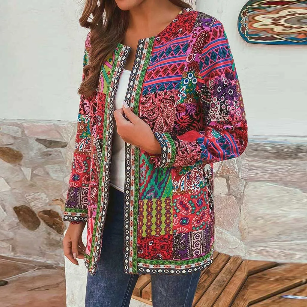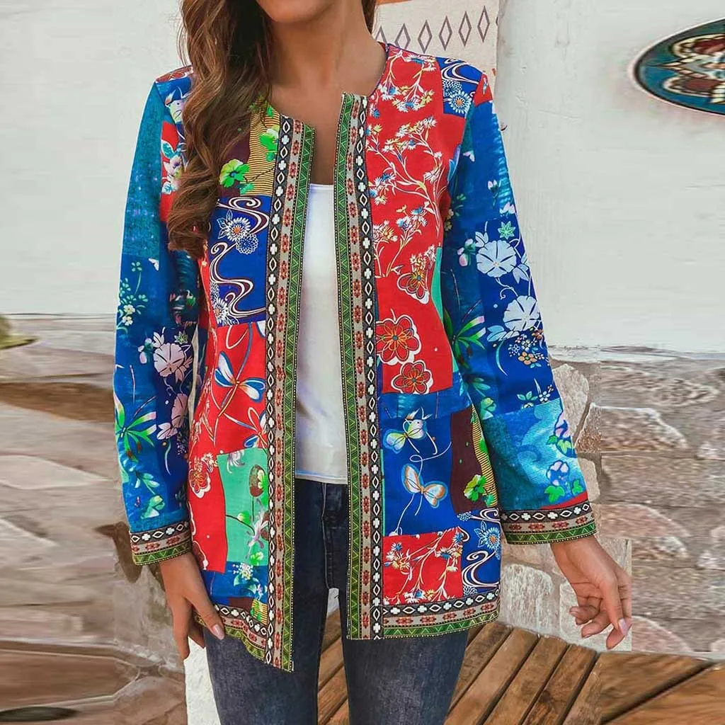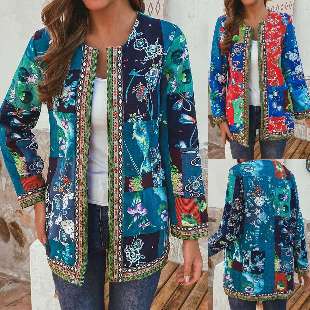 - Женское винтажное пальто с цветочным принтом и длинным рукавом в этническом стиле размера плюс
