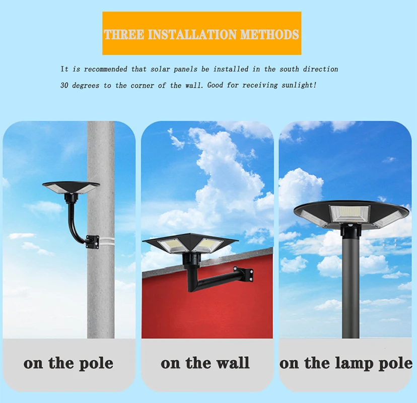 Спецификация: Название: 100/150/200/200W Солнечная НЛО садовый светильник Цвет корпуса: черный Режим: светильник + индукция человеческого тела + пульт дистанционного управления Материал: акрилонитрил бутадиен-стирол (ABS) + Поликарбонат (PC) Светильник источник питания: 100/150/ 200W Источник: светильник 5730SMD 240 Напряжение: 6 В Водонепроницаемость: IP66 Длительный срок службы: 50000 ч (светодиодный) 100 Вт: Количество светодиодов: 240LED 5730SMD Солнечная панель: 15 Вт/6 в поликремниевая солнечная панель Емкость аккумулятора: 15000ма Время разряда: 12-18 ч Расстояние срабатывания: 0-8 метров Цветовая температура: 8000K Размеры: 42 см в диаметре и 12,5 см в высоту 150 Вт: Количество светодиодов: 1120LED 2835SMD Солнечная панель: 15 Вт/6 в поликремниевая солнечная панель Емкость аккумулятора: 18000ма Время разряда: 12-18 ч Расстояние срабатывания: 0-8 метров Цветовая температура: 8000K Размер: 35*35*12,5 см 200 Вт: Количество светодиодов: 400LED 5730SMD Солнечная панель: 22 Вт/6 в поликремниевая солнечная панель Емкость аккумулятора: 200 мА Время разряда: 12-18 ч Расстояние срабатывания: 0-8 метров Цветовая температура: 8000K Размеры: 55 см в диаметре и 12,5 см в высоту Режим работы: 1. Индукция человеческого тела Когда он не яркий в течение дня, он автоматически включит режим датчика в темноте, люди будут полностью яркими и будут немного ярче, когда люди ходят, И через 15-20 секунд после того, как человеческое тело почувствует, человеческое тело автоматически станет ярче ночью! 2. Индукция человеческого тела + пульт дистанционного управления Он не яркий в течение дня и автоматически становится ярким, когда темнеет. Пульт дистанционного управления может использоваться для выбора обычного освещения, и два режима зондирования можно переключать назад и вперед. Применение: -Наружные стены или опоры на площадях, парках, садах, двориках, улицах, тротуарах, тротуарах, кампусах, фермах, окружающих помещениях безопасности и т. д. Характеристика: -Солнечная зарядка, нулевая зарядка. -Простота установки, провода не требуются -Светодиодный светильник высокой яркости, зеленый и энергосберегающий. -Высококачественный аккумулятор, длительный срок службы и большая емкость. -Корпус из алюминиевого сплава для предотвращения дождя. -Супер инфракрасный приемник. -Водонепроницаемость IP66. -Поликремниевые солнечные панели преобразуют солнечную энергию в электричество, что является более экологически чистым. -Технология обнаружения человеческого тела делает его более энергоэффективным. Он загорается, когда он чувствует движение, и темнеет, когда это не происходит. Посылка включает в себя: 1 х Солнечный уличный светильник 1 пульт дистанционного управления Примечание: * Включите выключатель перед установкой и зарядкой. * Пожалуйста, выберите удобное место, чтобы обеспечить достаточное количество солнечного света и достаточное количество солнечного света