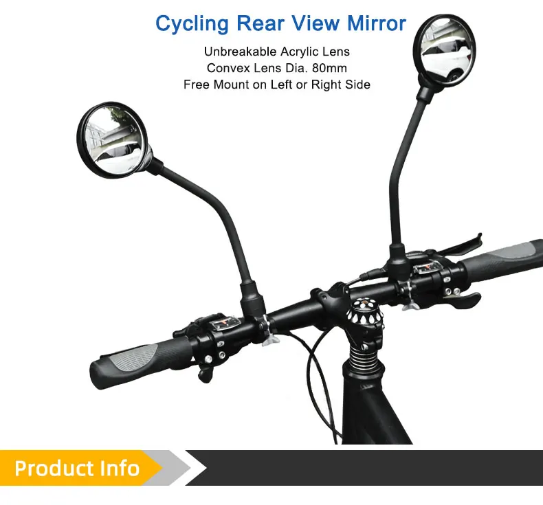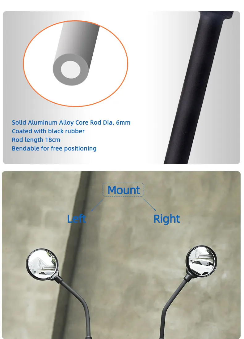 Это зеркало заднего вида имеет свободный Регулируемый угол наклона, что позволяет установить на руль с левой или правой стороны. Выпуклая линза, сделанная из акрилового материала и тонкой обработки поверхности, предоставляет небьющиеся функции и обеспечивает широкий и четкий обзор.