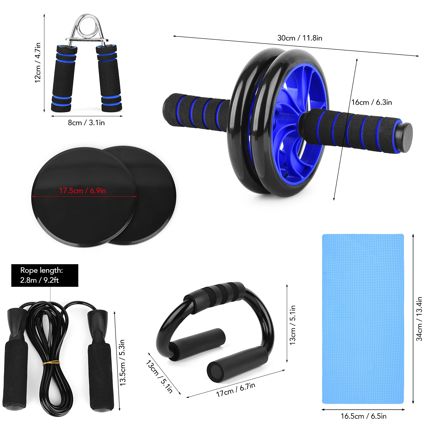 8 шт. набор для фитнеса: поставляются с 1 роликовым колесом, 1 наколенником, 1 скакалка, 1 ручной захват, 2 дисковых ползунка и 2 пуш-ап планки.