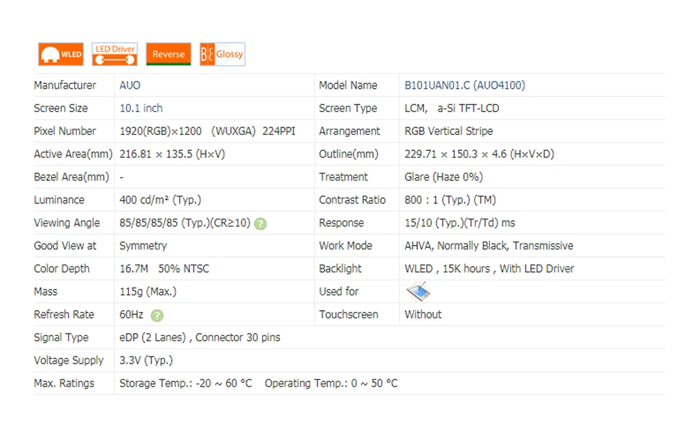 Отзывы о B101UAN01.C 1920 × 1200 IPS 50% NTSC eDP 30-контактный 400 кд/м² яркость 800:1 10 1 дюйма ЖК-дисплей для