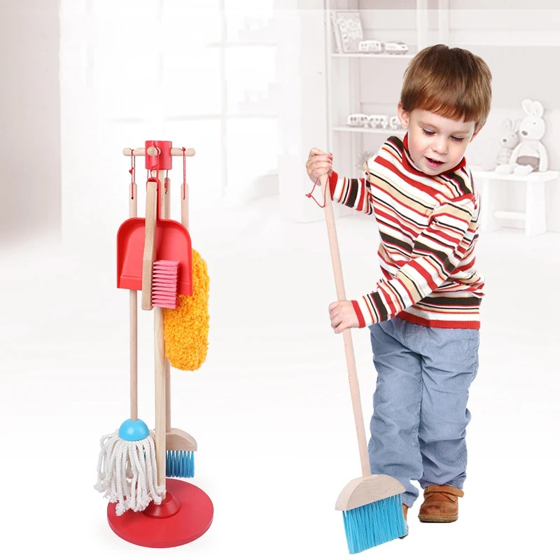 Реалистичные деревянные чистящие игрушки: Этот красочный детский набор размером выглядит так же, как настоящая вещь и включает в себя деревянную игровую метлу, швабру, тряпку, щетку и подставку для Организации. Красная Пыльник удобно крепится на все ручки.