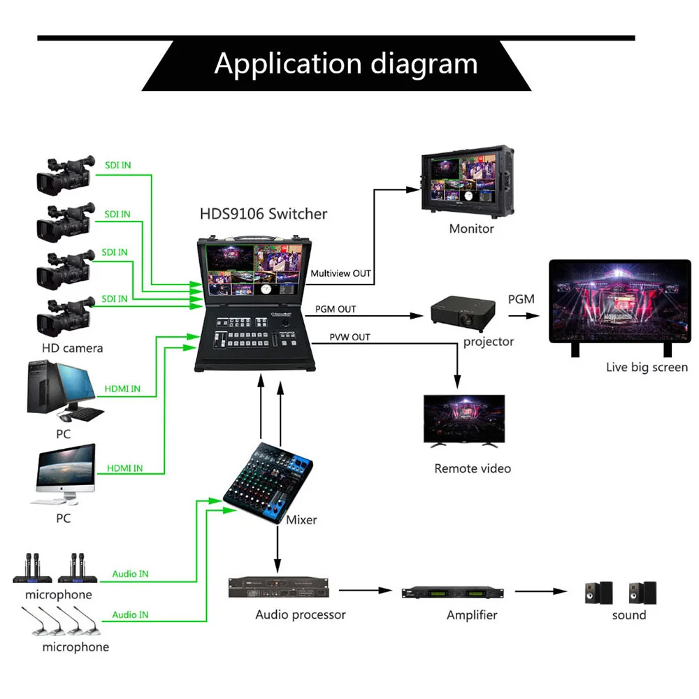 ◆ Усовершенствованный черный металлический корпус, высокая прочность и светильник вес ◆ встроенная клавиатура управления ◆ поддерживает до 4 SDI и 2 входа HDMI